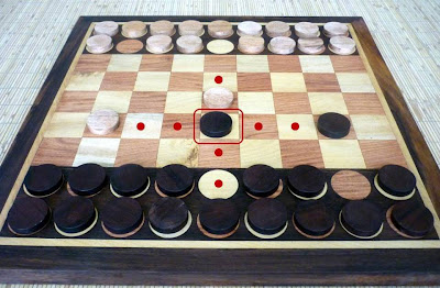 Le jeu se joue sur un plateau 9x9. Chaque joueur commence avec 18 pièces qui sont placées sur les deux premières rangées de chaque côté. La position de départ est affichée sur l'image ci-dessus.