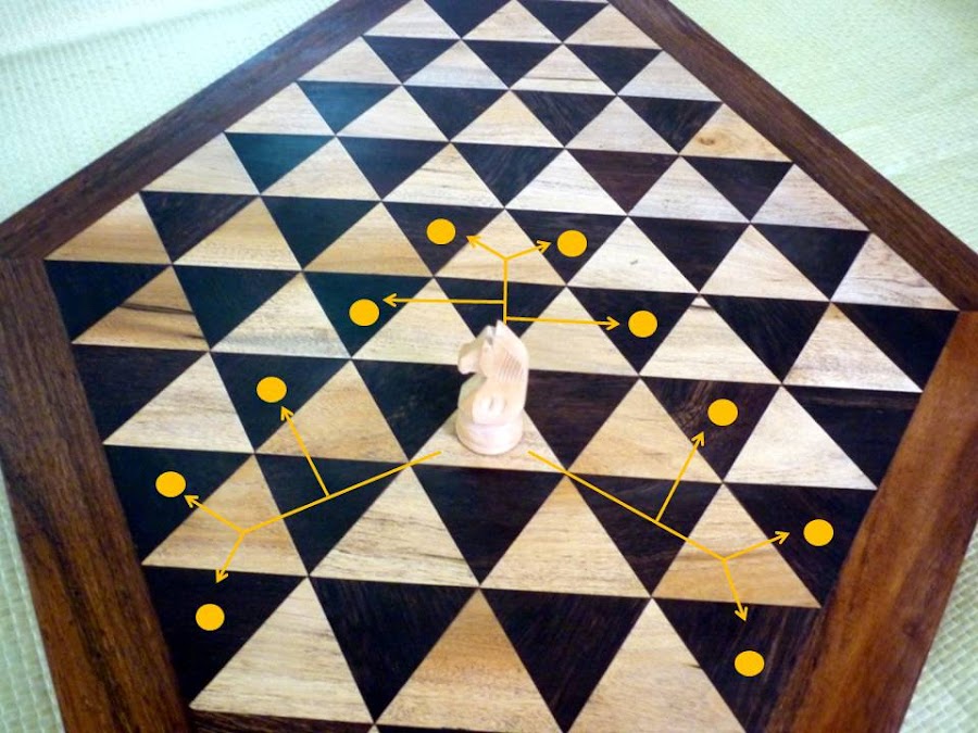 As the shape of the board is composed of triangles, rather than squares, the movement patterns for the various pieces have needed to be modified so that they can cope with the new style.